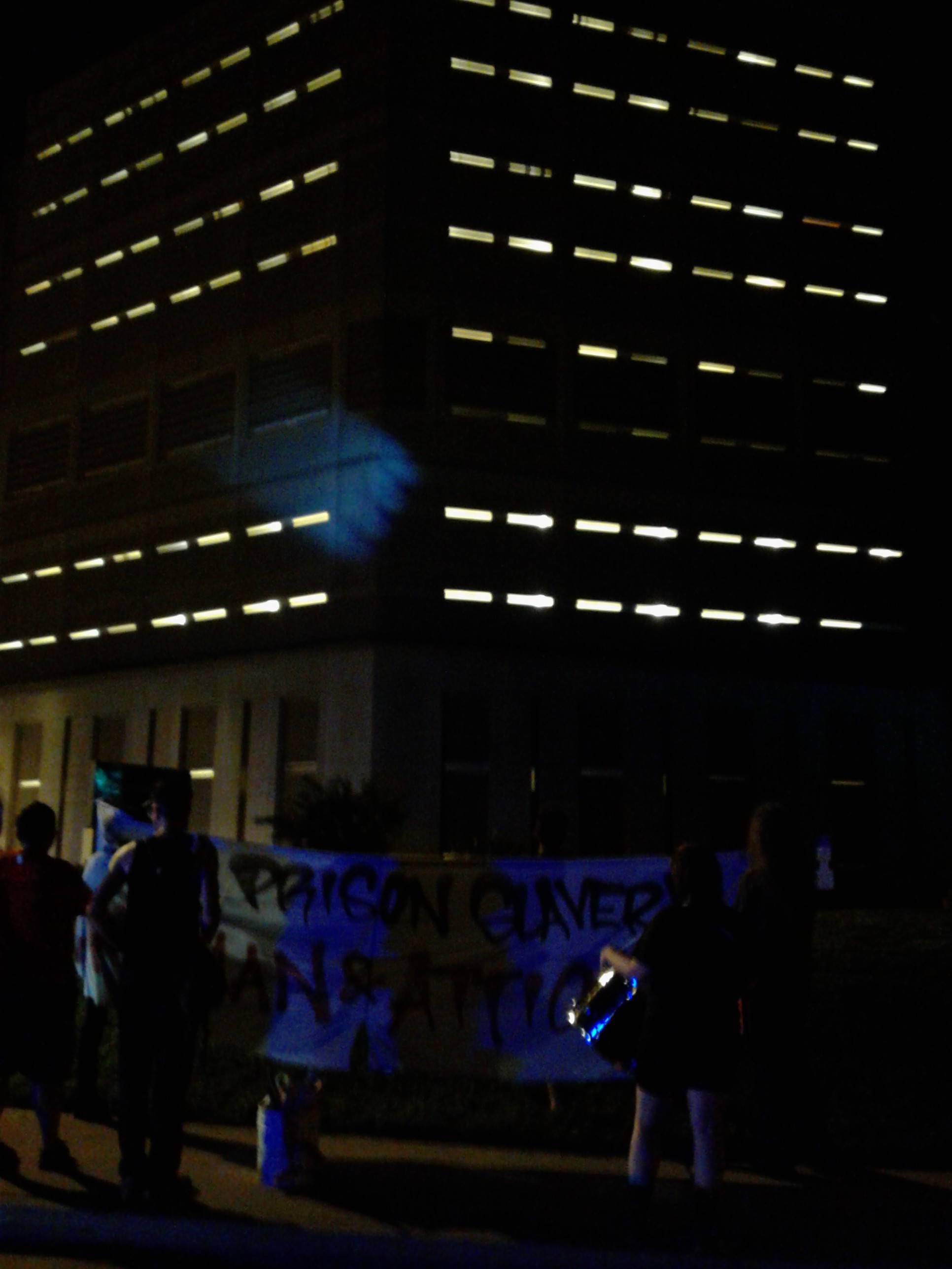 The vast and open terrain at this facility was particularly unfavorable to us, and while our confrontational energy created space between us and the officers, it proved highly difficult to disperse safely without being followed. At the close of the night, some demonstrators returning to their cars found their only exit blocked off by police cruisers. After a small group was detained by almost twenty deputies, one protester was ultimately singled out and arrested on a prior warrant.