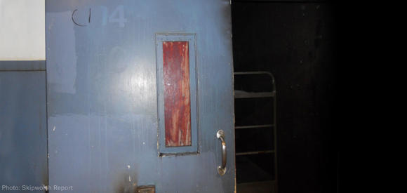 A cell door is covered with blood resulting from a prisoner’s self-inflicted injury at the East Mississippi Correction Center where mentally ill inmates are held in solitary confinement without proper treatment, according to a recent lawsuit (Photo source: Skipworth Report via ACLU).